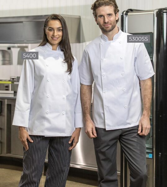 The sharp look and substantial feel of 100% cotton marks this style as the perfect blend of crisp lines and lasting comfort. The natural fibres of this chef coat puts the focus on keeping cool when the heat is on. 100% Cotton 8.2-oz. Twill Fabric Sizes range from XS-4XL Style #: 5400 – Plastic Buttons