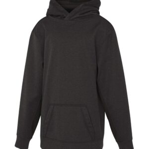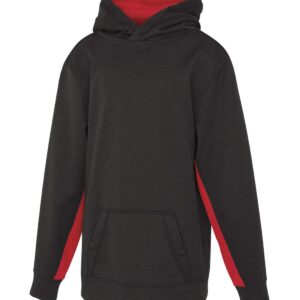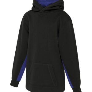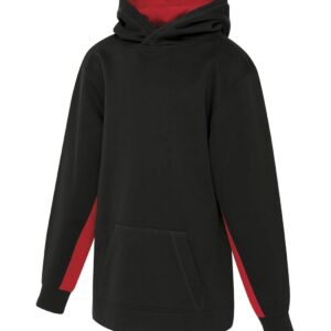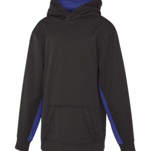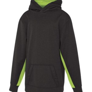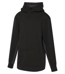 9.3-oz, 100% anti-static polyester fleece Contrast panel underarms 3-panel double lined contrast hood with no drawstring Moisture Wicking Breathable Flat Lock Seams DUE TO THE NATURE OF POLYESTER, SPECIAL CARE MUST BE TAKEN THROUGHOUT THE DECORATION PROCESS.