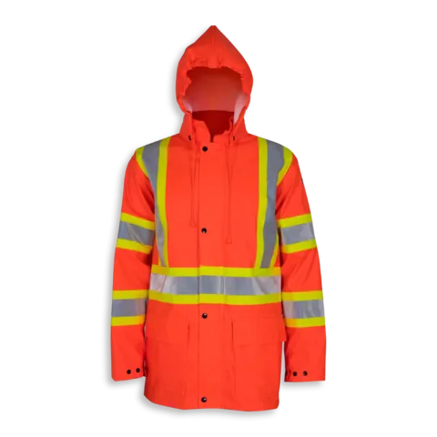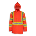 Flame Resistant Waterproof Orange Hooded Jacket Big K’s Orange FR treated 100% polyurethane/poly jacket meets CGSB 155.20-2000 Type 3 standard. It is oil and chemical resistant, 100% waterproof and windproof, lightweight and tough with 4-way stretch PU and 4” reflective tape (2 rows on each arm). It has heat welded seams, an extra-large detachable hood, full front zipper with snap storm placket, 2 bottom pockets c/w velcro,  and 1 inside pocket c/w flap.  It meets CSA Z96-22 Class 2 Level 2 and Class 2 Level FR (becomes Class 3 when worn with FR hi-viz pant featuring reflective leg bands) and ANSI/ISEA 107-20 Class 3 Type P and R